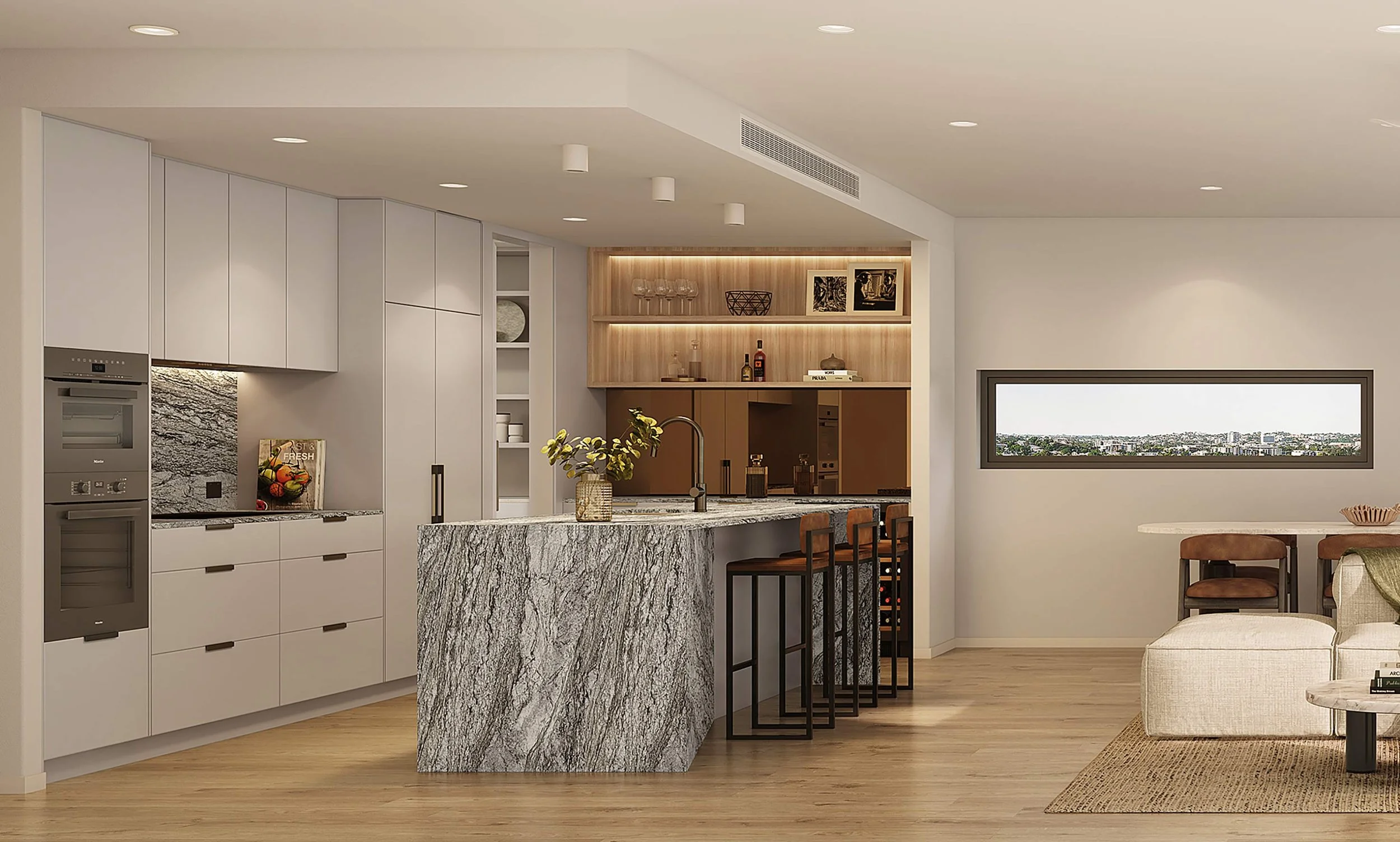 An inspired living space unfolds as you enter – where bold surfaces and textured finishes usher you through the well appointed space. Morning light spills through full-height glazing, dancing across warm European Oak floors and guiding you toward the generous alfresco balcony. Thoughtfully curated materials envelop the space in warmth and elegance, creating a space that’s as functional as it is refined.