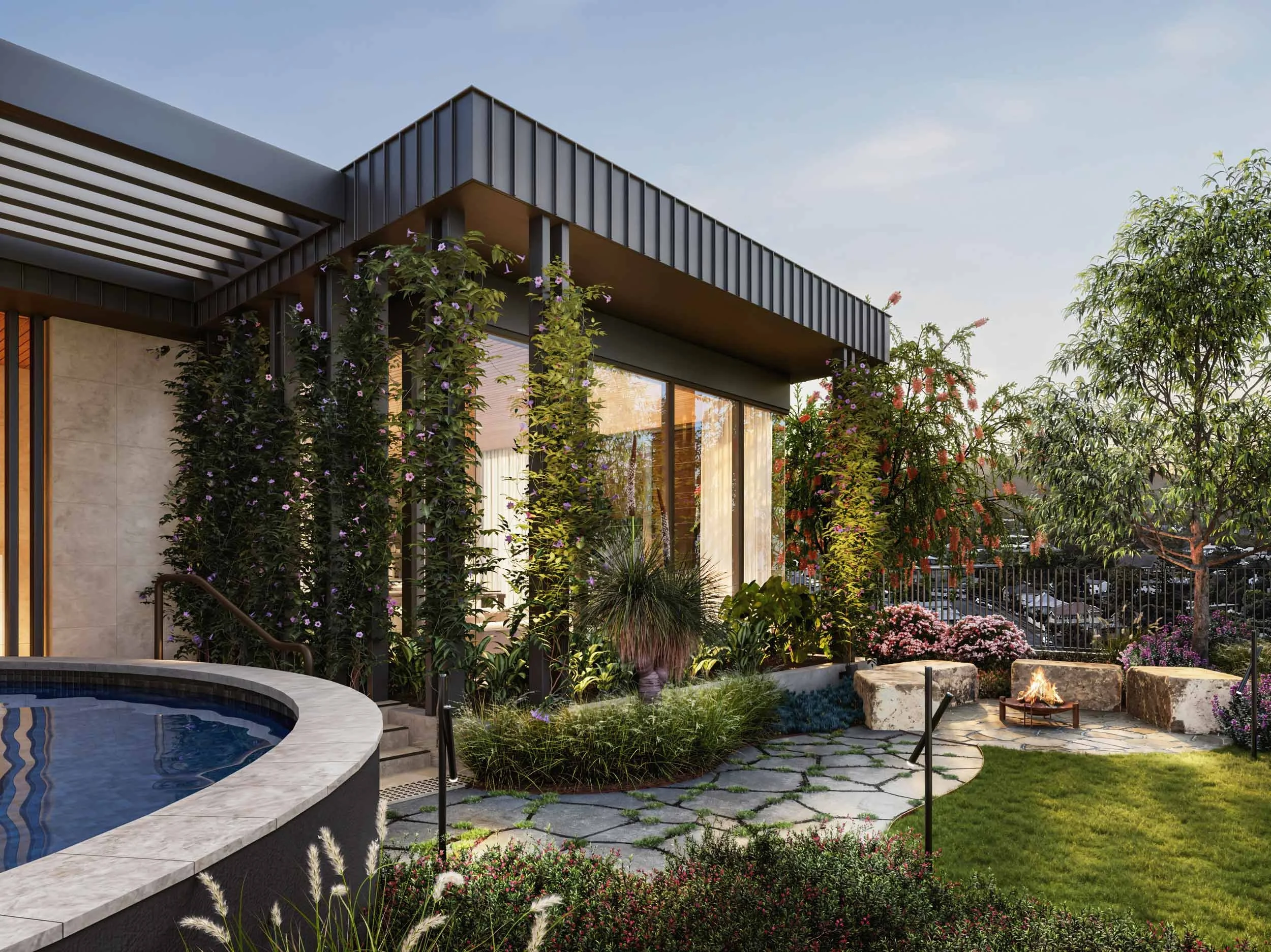 Ascend to the rooftop and let the pace of life slow. Here, native trees gently sway in the breeze, framing panoramic views across the city skyline. Summer days invite private dining and a refreshing plunge into the circular pool. Truly a jewel in the crown, the rooftop offers a place of connection – with nature, neighbours, and self.