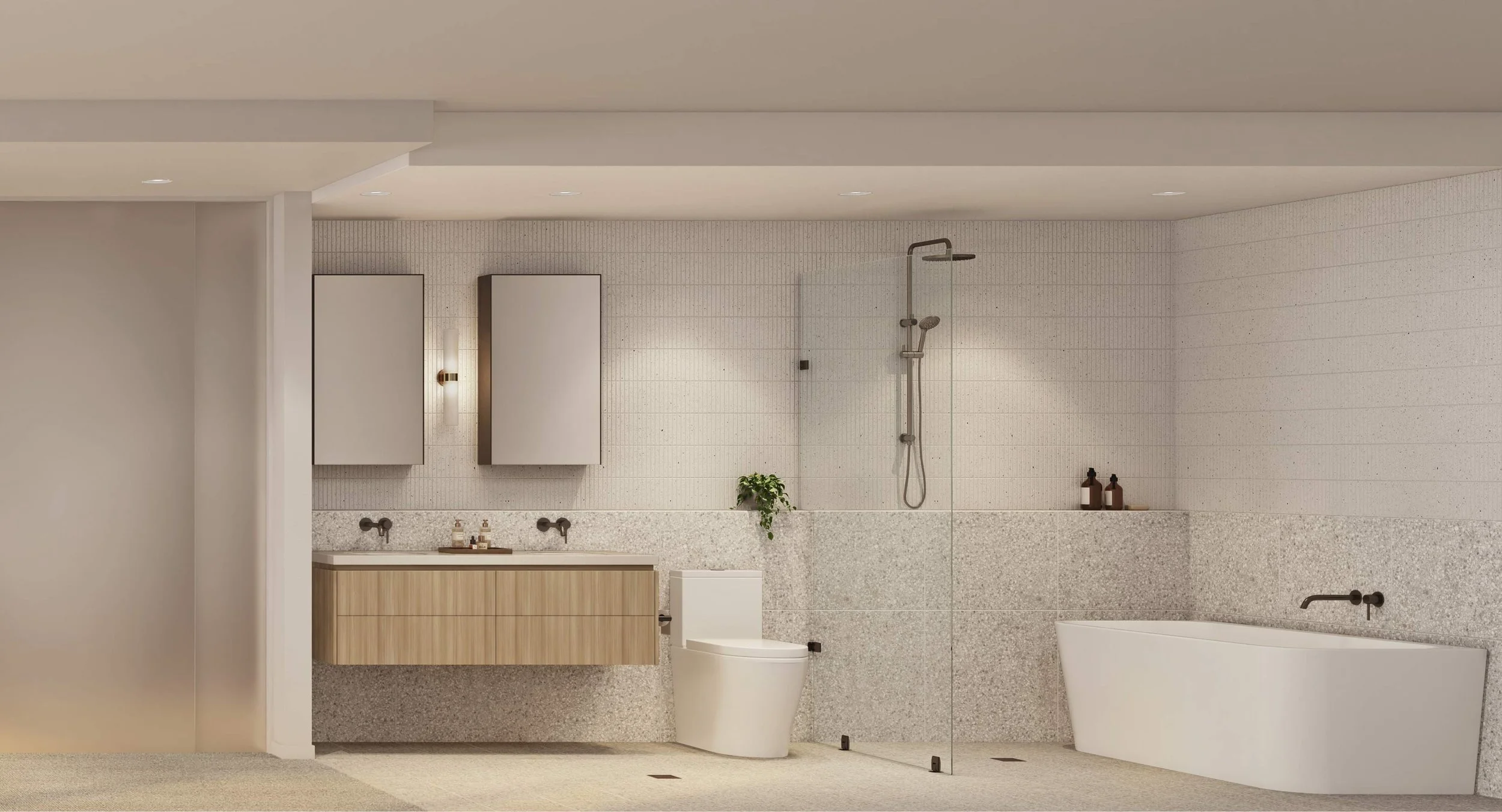 Stepping into the ensuite, where a mosaic of stone and Kyoto Finger tiles envelop the space, a sculptural freestanding bath stands as the centerpiece.