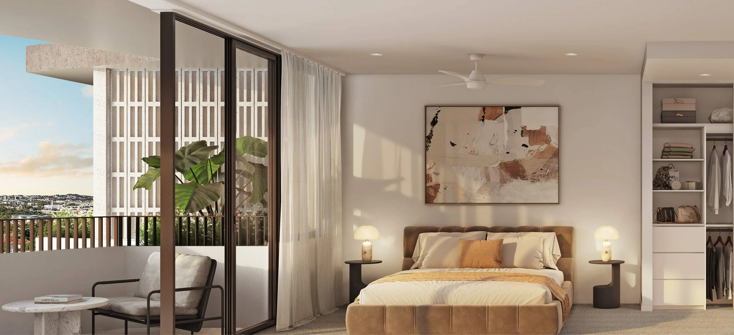 The master suite welcomes you with an immediate sense of calm and tranquility. Underfoot, plush carpet softens each step, while full-height glazing floods the space with natural light – opening seamlessly to a private balcony overlooking Herston’s historic landmarks.